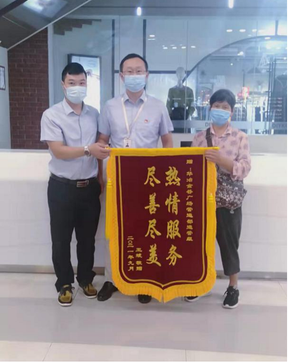 9月29日上午,金谷廣場顧客秦女士把一面鐫繡“熱情服務,盡善盡美”字樣的錦旗送到了華冶商管公司手里,以此來表達對商管公司優質服務的肯定。